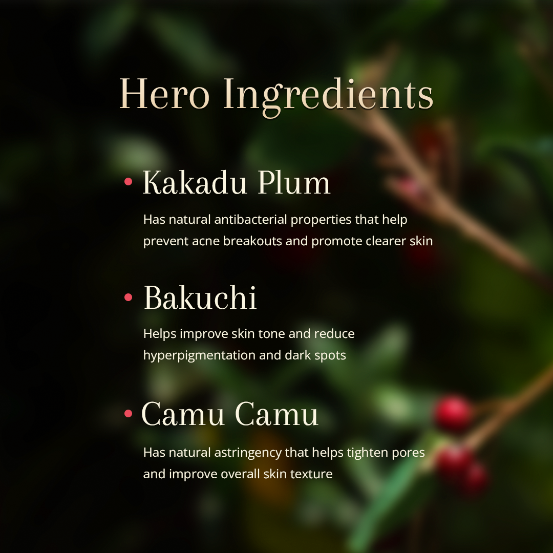 And other enriching ingredients such as Licorice root, Alpha Arbutin, Pomegranate, hibiscus and grape skin extracts and much more..